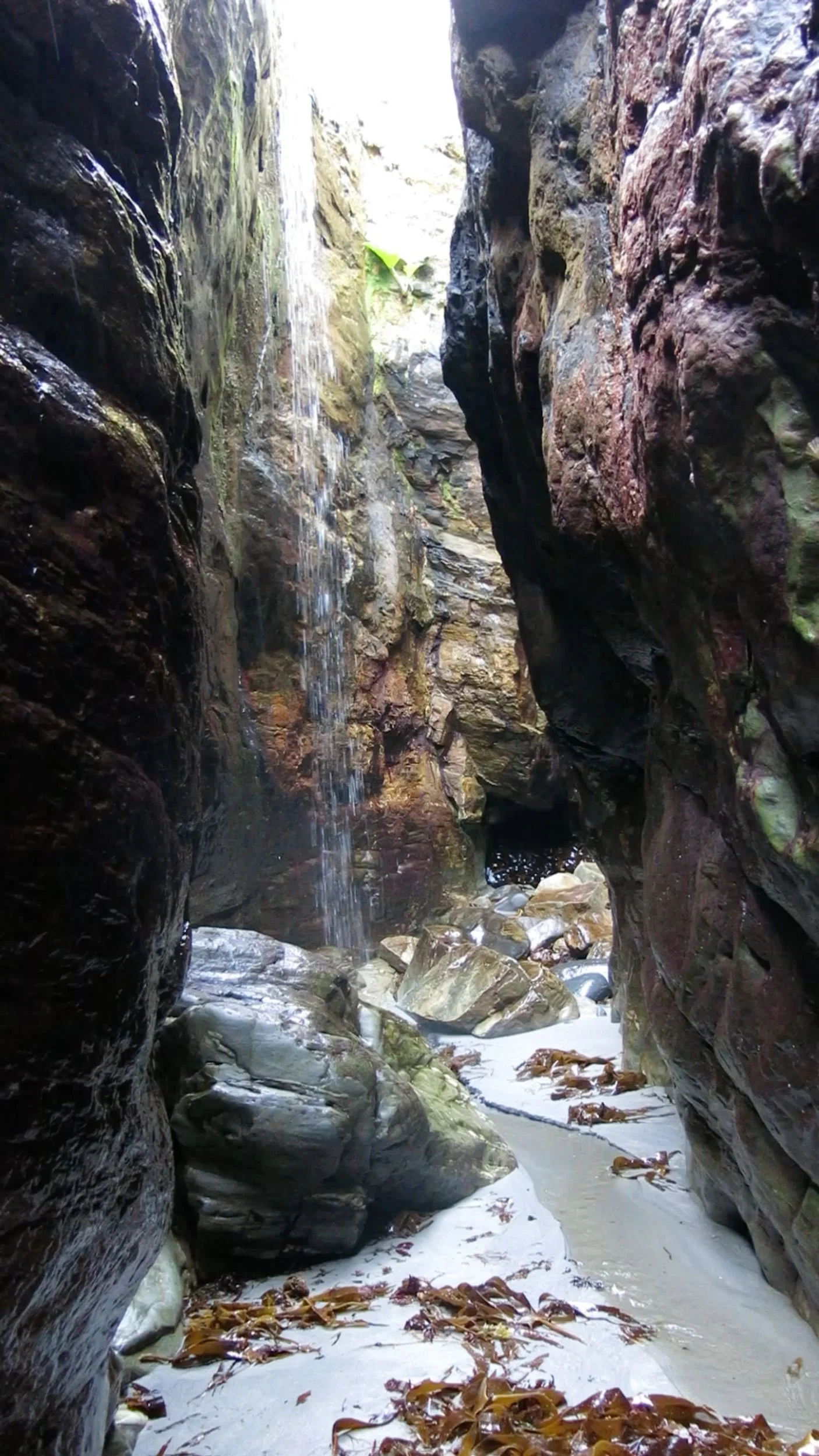 A projection from above covered the surface with a tidal cave, light shining through a fissure in the rock. Water dribbled through stone and sand to the drain.